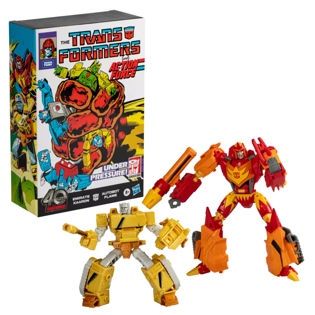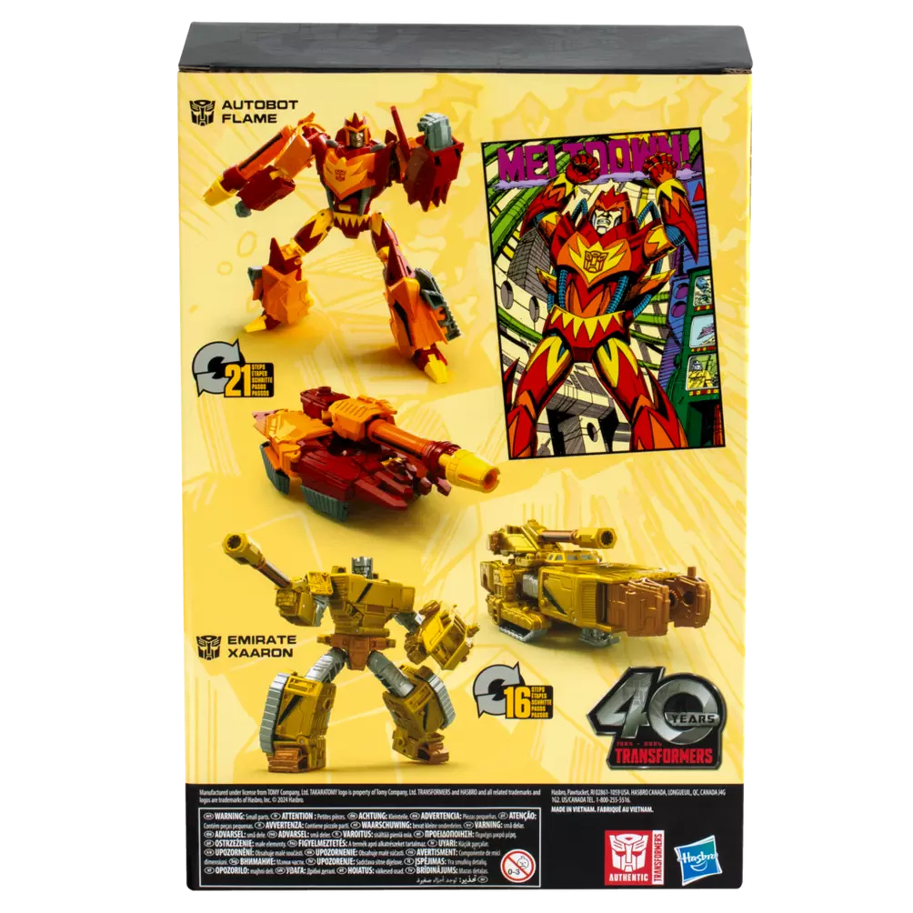 These Emirate Xaaron and Autobot Flame action figures feature comic-accurate deco and details, celebrating 40 years since the first Transformers comics were issued in 1984. Emirate Xaaron leads the Autobot Resistance movement. Flame lost his reputation as a scientist and is determined to carry out his master plans. Comic book Transformers bots are stepping off the page and onto collectorsrsquo shelves with Transformers Comic Edition Emirate Xaaron and Autobot Flame These comic-inspired action figures each convert from robot to Cybertronian tank mode and come with blaster, cannon, shield, and tank tread accessories. - COMIC EDITION AUTOBOT FLAME amp EMIRATE XAARON 2-PACK Flame and Emirate Xaaron are leaping out of the comic panels and into your collection this 2-pack is inspired by the original The Transformers comic book series- COMIC-ACCURATE DECO With comic-accurate deco and black line hatching details, these Transformers figures look like they came out of a comic book, celebrating 40 years since Transformers robots made their comic debut- CONVERTING AUTOBOT FLAME FIGURE 6.5-inch Transformers Autobot Flame figure converts from robot to Cybertronian tank mode in 21 steps- CONVERTING EMIRATE XAARON FIGURE 5.5-inch Transformers Emirate Xaaron figure converts from robot to Cybertronian tank mode in 16 steps- AWESOME ACCESSORIES Emirate Xaaron figure comes with 2 tank treads, blaster, and shield accessories Autobot Flame figure comes with a cannon accessory Add to your Takara Tomy Transformers Generations 40th Anniversary line and order your new Flame amp Emirate Xaaron Comic Edition