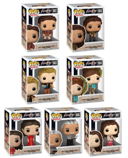 Make room for some new cargo in your Funko POP! Television collection with a complete set of 7 Firefly vinyl bobblehead figures, including Malcolm Reynolds, Zoe Washburn, Hoban Washburne, Kaylee Frye, Inara Serra, Shepherd Book and River Tam.