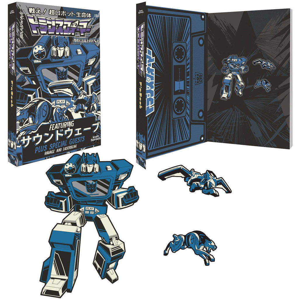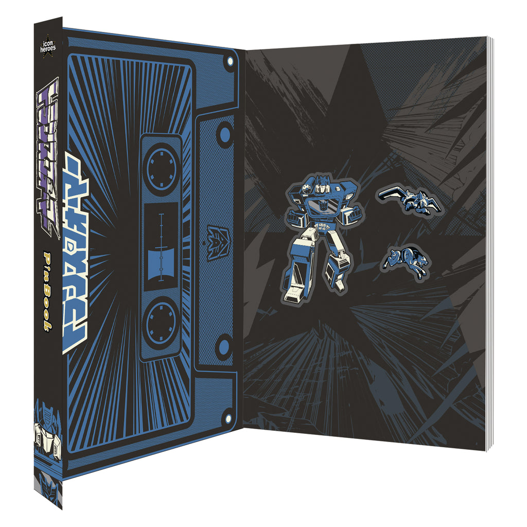 Icon Heroes presents the Transformers Soundwave Noir PinBook! Transformers are going back to their past with a comic ’Noir’ look. Influenced by Japanese comic book styles and accompanied with a limited color palette, each limited-edition pin is individually numbered with a matching number on the book. PinBooks feature a set of beautifully designed hard enamel pins packaged in a book-style packaging with stunning cover art.