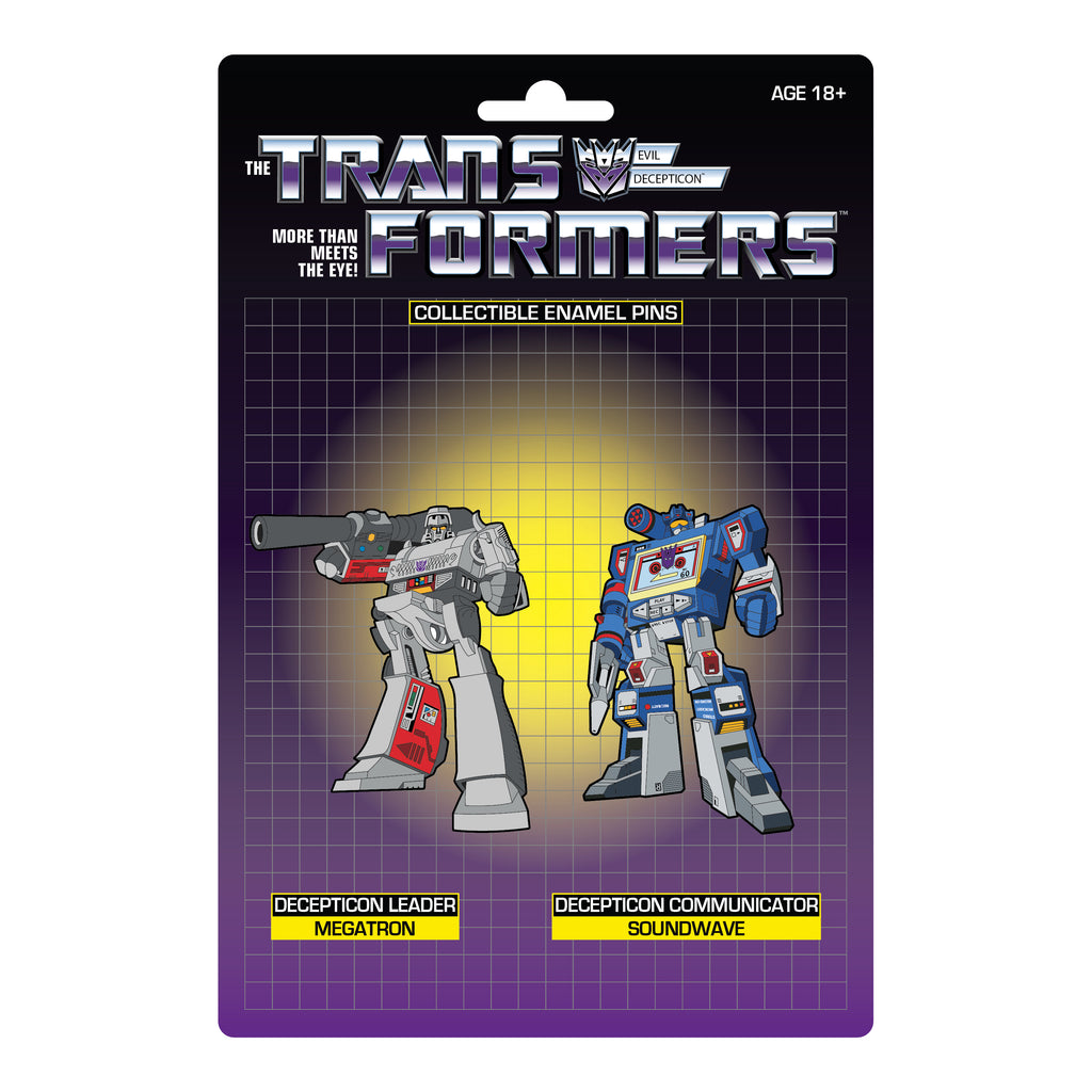 Icon Heroes presents the Transformers Megatron X Soundwave Retro Pin Set! Based on the vintage toy box art, each limited edition hard enamel pin measures approximately 3" tall and is individually numbered and packaged on a retro-style 6" x 9" card back. The pins and card back are packaged inside a clamshell box to keep them safe and secure when not in use. Collect them all! Limited edition of 2,000 pieces.