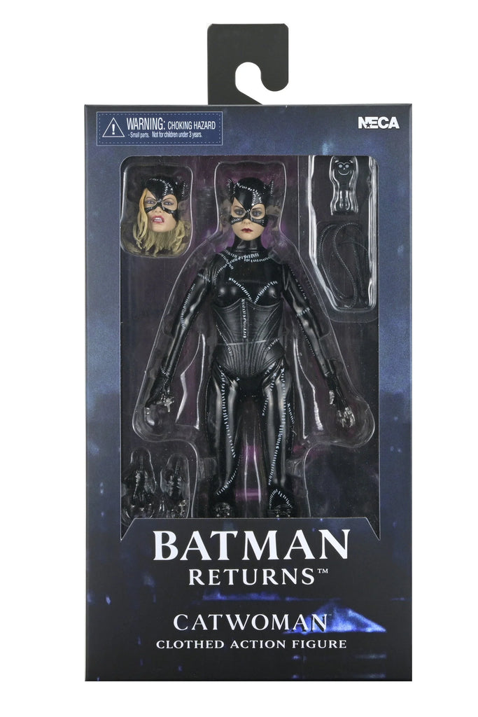 NECA presents this clothed action figure of Catwoman from Batman Returns, featuring the authorized likeness of Michelle Pfeiffer, whose unforgettable performance in the 1992 Tim Burton film still defines the character. Selina Kyle, the repressed and belittled secretary of corrupt industrialist Max Shreck, leads an uneventful, ordinary life. That is, until he tries to kill her after she discovers his sinister secret to siphon off power from the Gotham electrical grid, giving Shreck full control of energy for Gotham City. After surviving the fall and being awakened by alley cats, she unleashes her true, fierce nature and is re-birthed as Catwoman. She allies herself with The Penguin to exact revenge against Shreck and the Batman, who is trying to foil their criminal master plans.