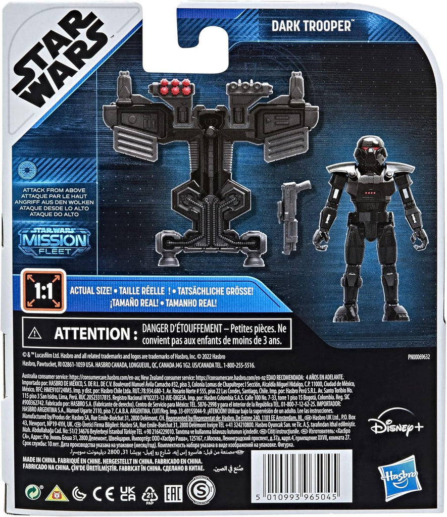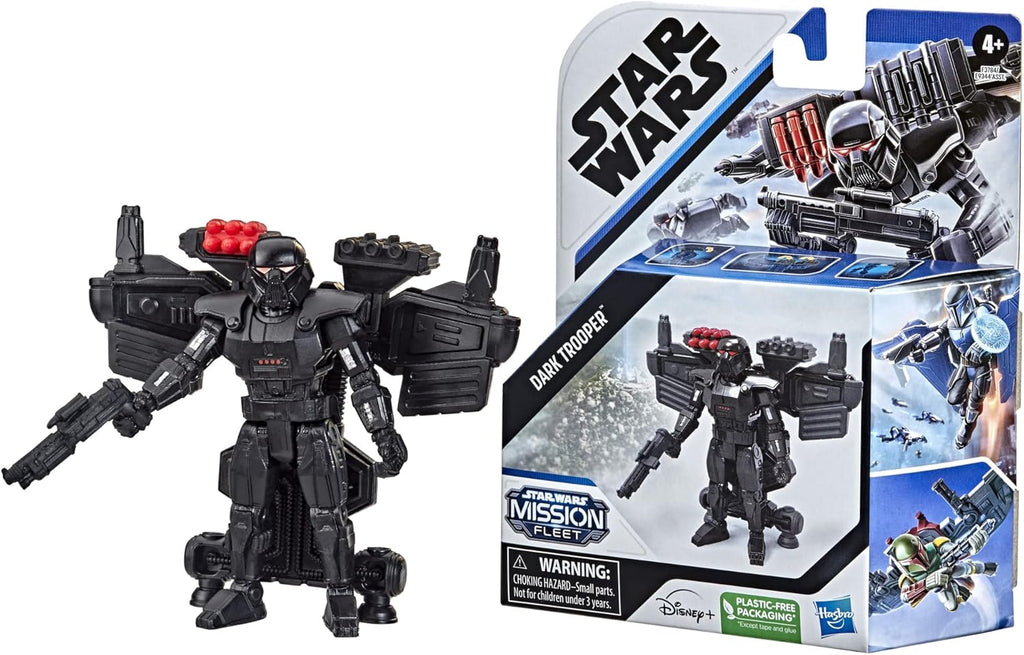 Hulking Imperial combat droids with gleaming black armor and powerful jet boots, the Dark Troopers are a powerful design. Blast off into a galaxy of adventure with the Star Wars Mission Fleet figures and vehicles! These fun figures and vehicles allow kids to imagine action-packed battles between the dark side and the light side of the Force. The Star Wars Mission Fleet Dark Trooper Attack from Above set includes a Dark Trooper action figure, an armored jetpack that attaches to the Dark Trooper, and a blaster rifle accessory. Star Wars Mission Fleet toys are kid-friendly and make a great introduction to the Galaxy of Star Wars for boys and girls ages 4 and up! May the Force be with you!