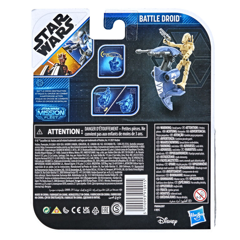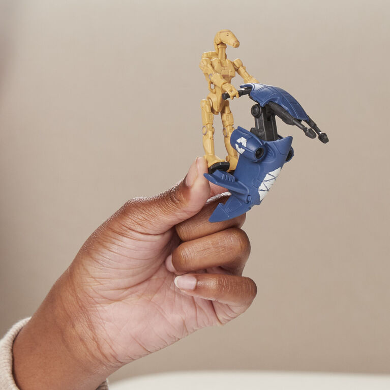 Battle Droids are dim-witted and no match for Clone Troopers, or Jedi, but they were not designed to be smart -- they were designed to overwhelm. Rather than use flesh-and-blood warriors, the Separatists prefer mindlessly loyal soldiers that are easily controlled. The soulless ranks of their armies are dominated by tall, thin B1 Battle Droids. Blast off into galactic action and adventure with the Star Wars Mission Fleet figures and vehicles! These fun figures and vehicles allow kids to imagine action-packed battles between the dark side and the light side of the Force. Star Wars Mission Fleet toys are kid-friendly and make a great introduction to the Galaxy of Star Wars for boys and girls ages 4 and up! May the Force be with you!