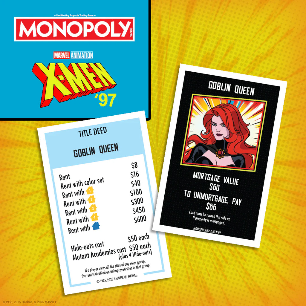 Buy, sell and trade to build your ultimate mutant team with Cable, Wolverine, Jean Gray, Magneto and Morph! Features 6 custom-sculpted tokens: Cyclops-Visor, Gambit-Cards, Magneto-Helmet, Storm-Thunderbolt, Wolverine-Cowl and Rogue-Gloves. Chance and Community Chest (Renamed Human and Prime Sentinels) cards unleash unexpected twists, from gaining new powers to facing off against classic villains.